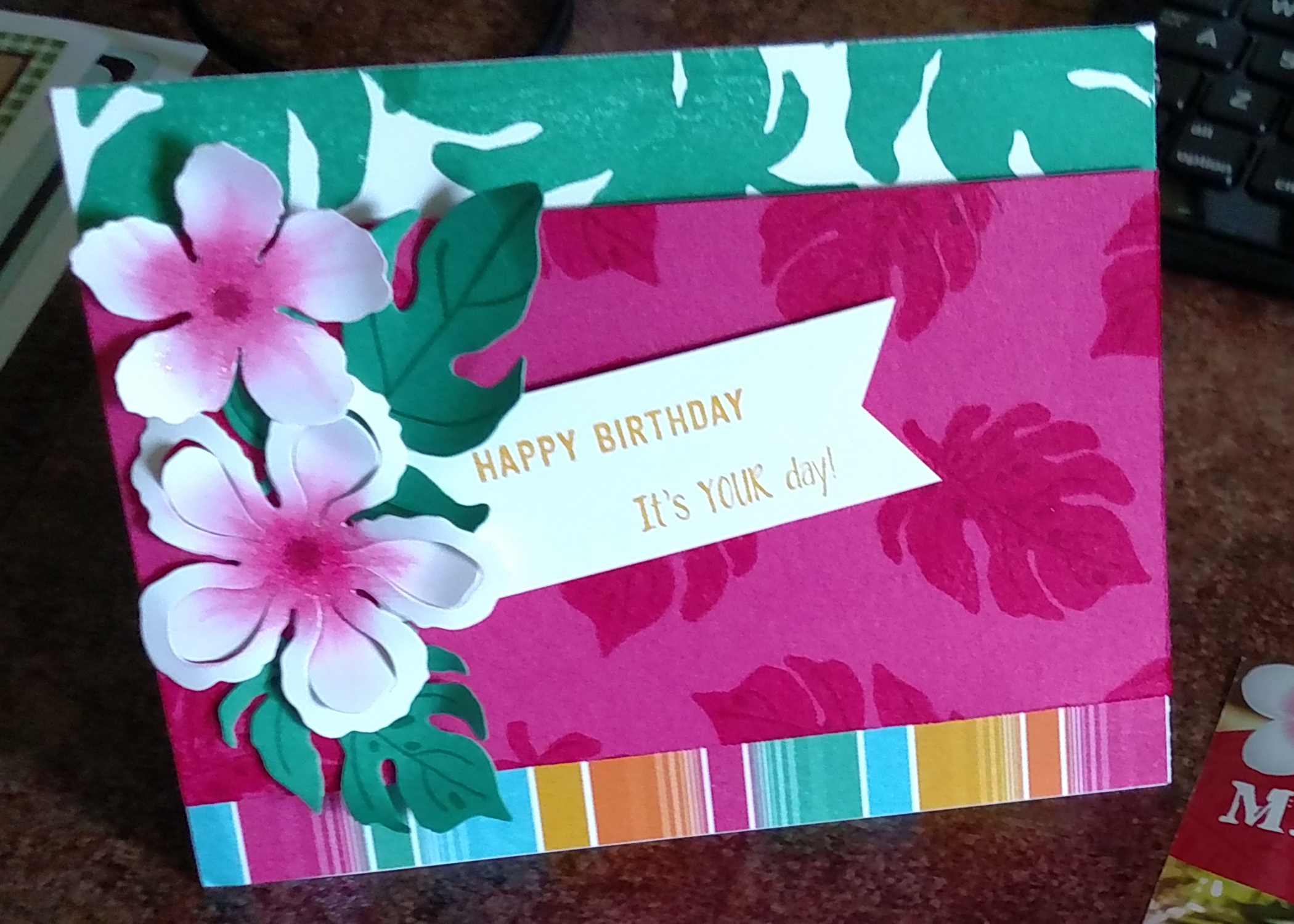 So, I saw this and thought surely, I could create a card that looked similar to that. I started racking my brain about which stamp set I could use to create the plumeria flower. Not sure if you can see it, but there are flowers in the background of the Margaritaville banner. How on earth could I recreate that? And, what colors could I use to recreate the stripes at the bottom.