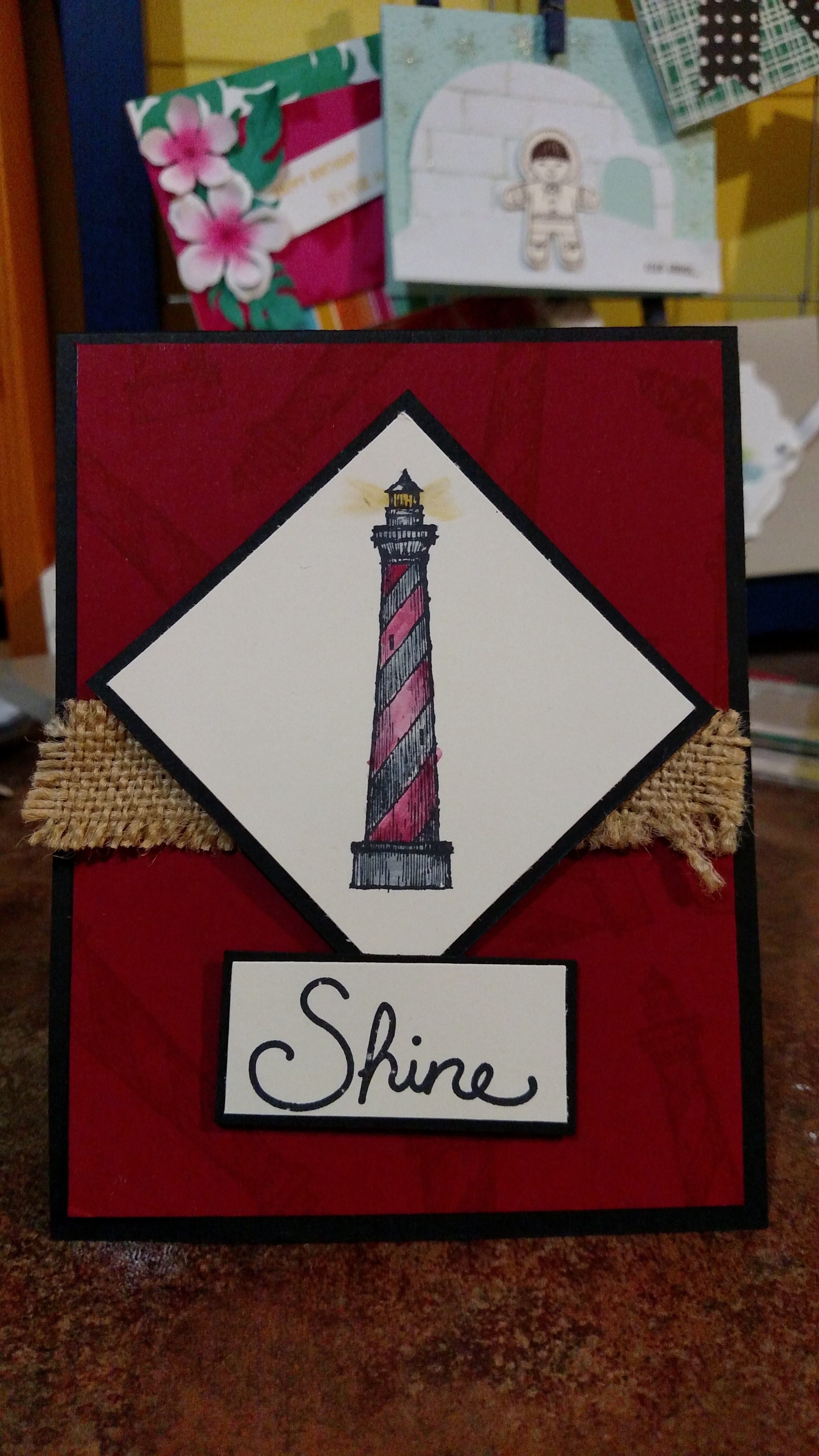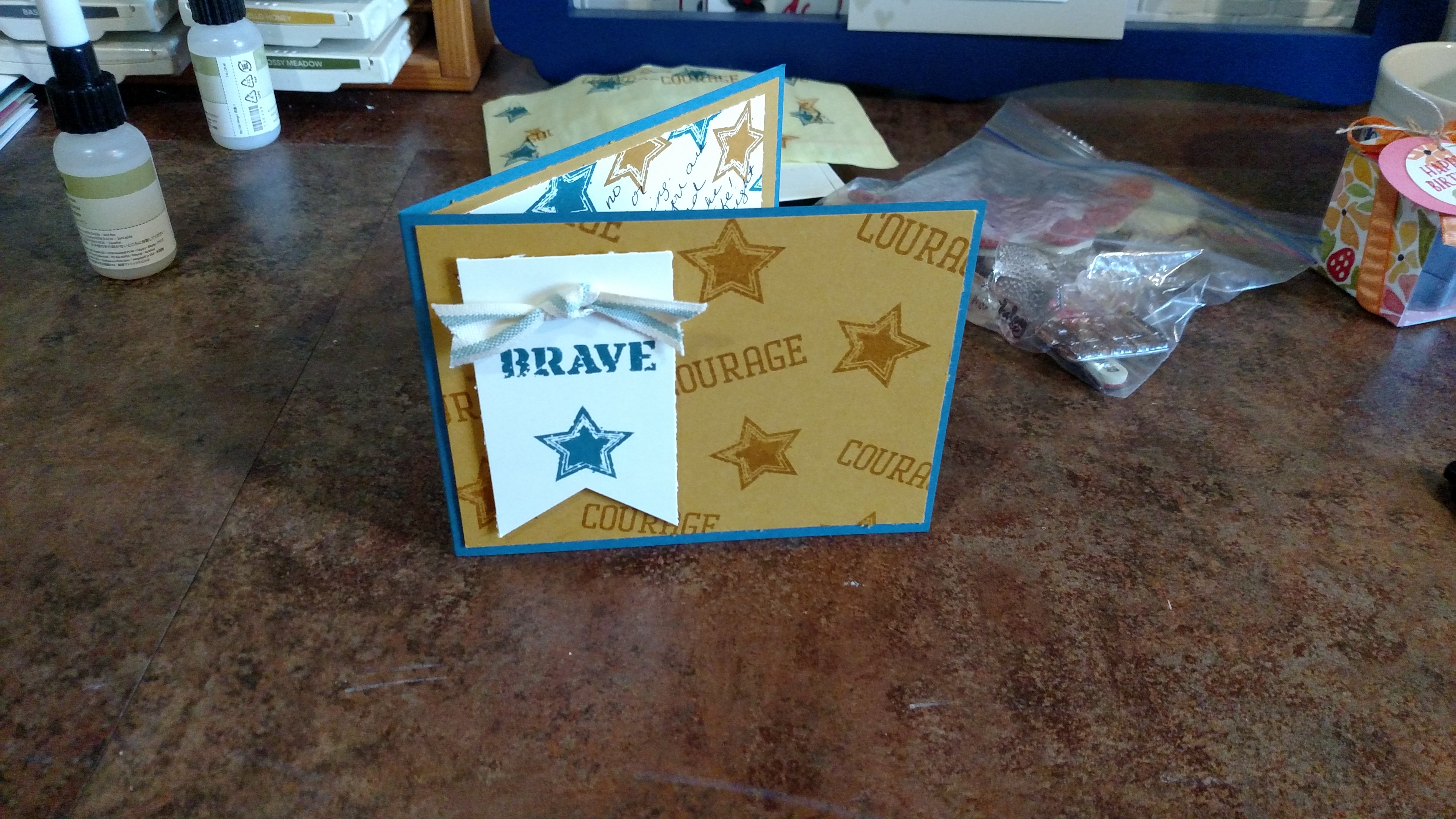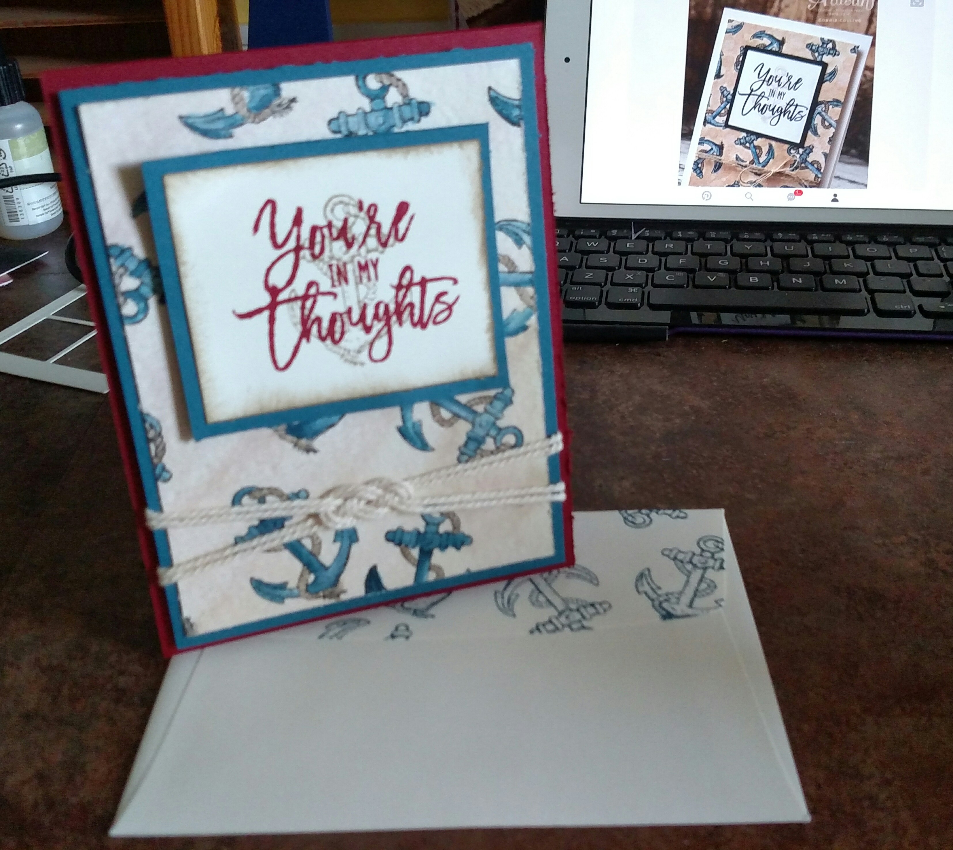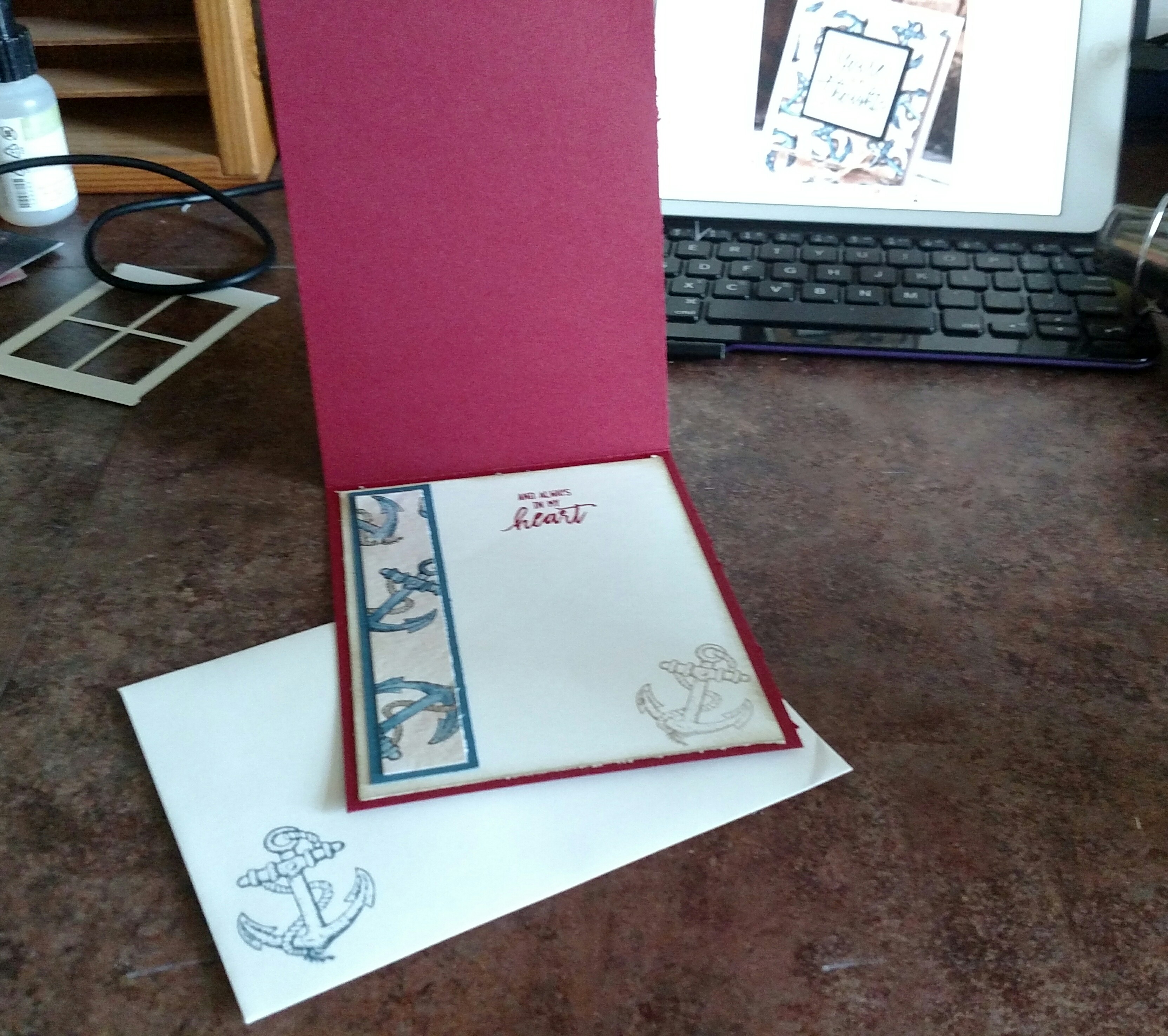 Of course… there was the one card that led to a card making frenzy for new sailors. Dell showed my cards to his division mates. They all loved the one shown below. Dell, the caring guy he is, told them all, and more, that I would be more than happy to make a card for each of them. The purpose of the card was for the Sailors to send the cards back home to a school, a church, or a person that sent them special encouraging words just to say “Thank you for thinking about me!” With such a sweet cause, how could I not. Of course, the card they loved was one that I had CASE’d from the Artisan team and wasn’t one that just was simple stamped layers. Oh no, it involved water coloring, multiple stamps, knot tying… But, what can I say? I love my boy!!! So, I made 168 cards for those Sailors. As they were made and packaged in clear envelopes with a stamped mailing envelope and a note of encouragement from me, I said a little prayer for the Sailor and the recipient.